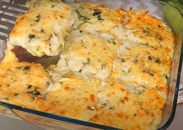 - Достаем форму с кабачками и заливаем их соусом. Все присыпаем измельченной зеленью и тертым сыром. Отправляем заготовку в духовку и запекаем еще 15-20 минут.